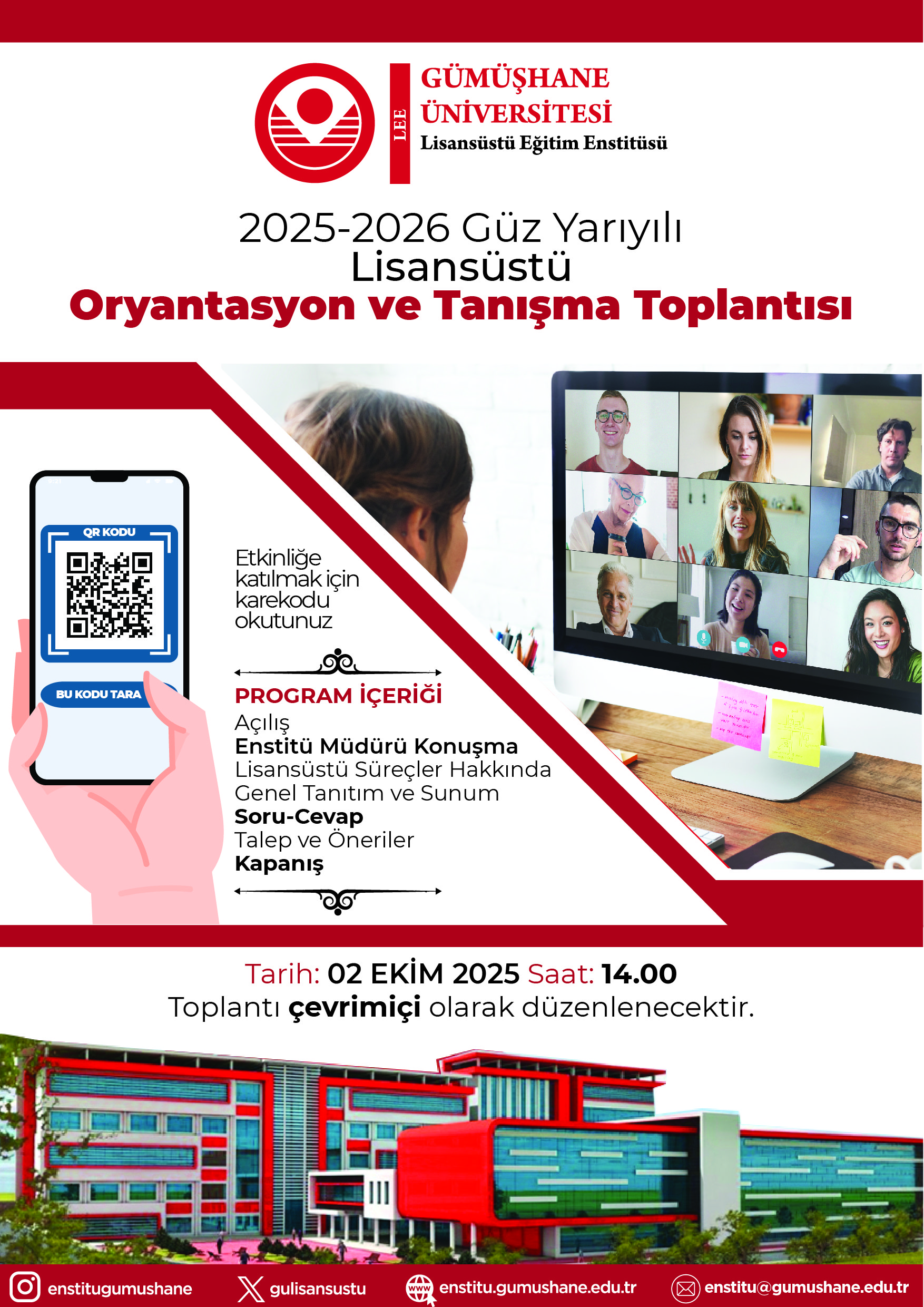 Gümüşhane Üniversitesi Lisansüstü Eğitim Enstitüsü olarak, yeni dönemde aramıza katılan tüm lisansüstü öğrencilerimizi çevrim içi yapılacak oryantasyon ve tanışma toplantısına davet ediyoruz.